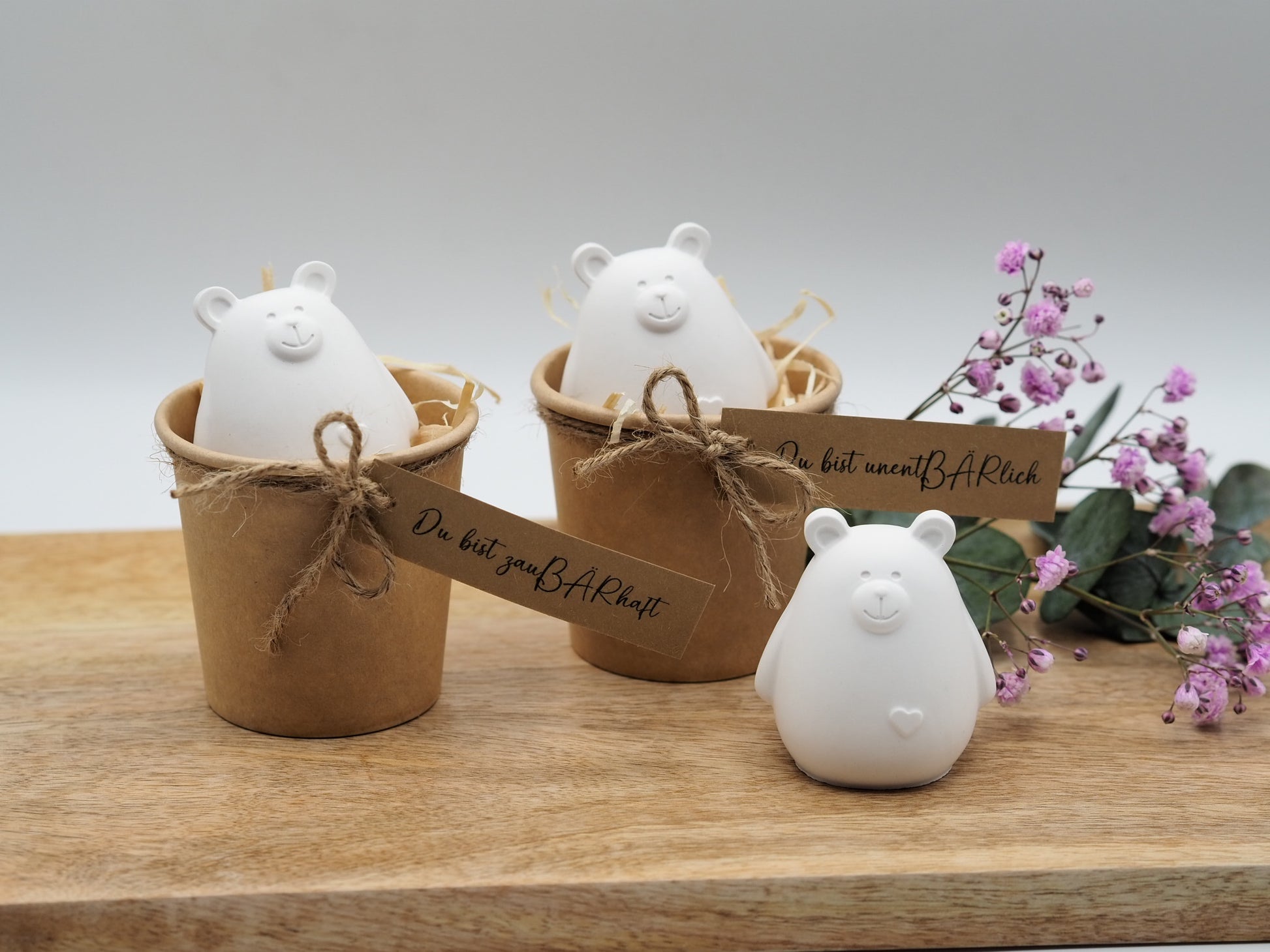 Kleine Deko-Bärenfigur mit Herz und Botschaft im Pappbecher - perfekt zum verschenken und mitbringen!